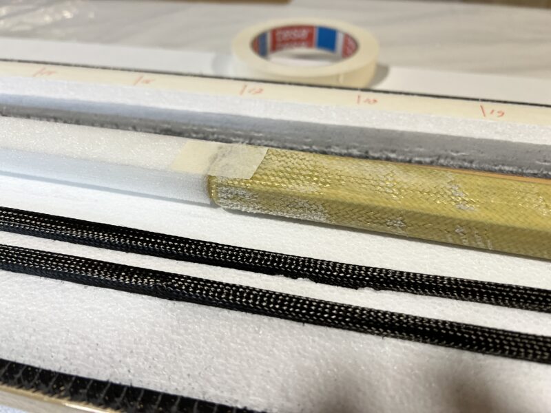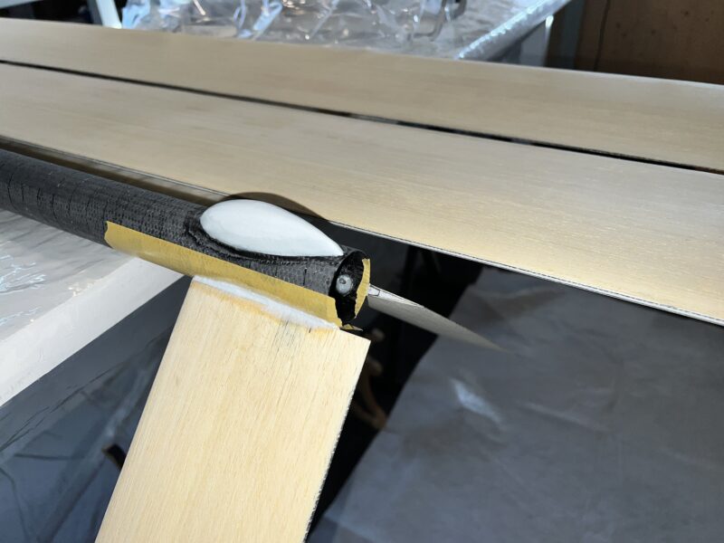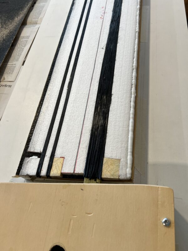 I got a question via the comments form on the buildup of the main spar, especiall how I connect the sleeve of the wing joiner with the rohacell core of the main spar. I always glue the different core bits of the main spar together using 5 minute epoxy, fixed with a small piece of painters tape (picture below). This is really only to make sure that the core of the main spar stays together while handling. It doesn’t add to the stiffness of the wing. The stiffness of the wing is provided by the carbon sleeve around the entire core (from wing root to wing tip), by the carbon rovings below and on top of the main spar (for the Monerai 2×19 at the root and 2×2 at the tip) and of course the carbon layup underneath the ebechi (note that the carbon layup continues under the main spar for the entire length of the wing, in the first 75% of the wing covering the entire width of the wing, in the last 25% only the carbon D-Box as well as the area of the control surfaces).