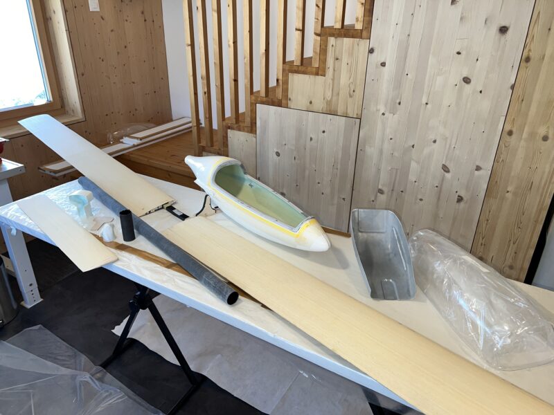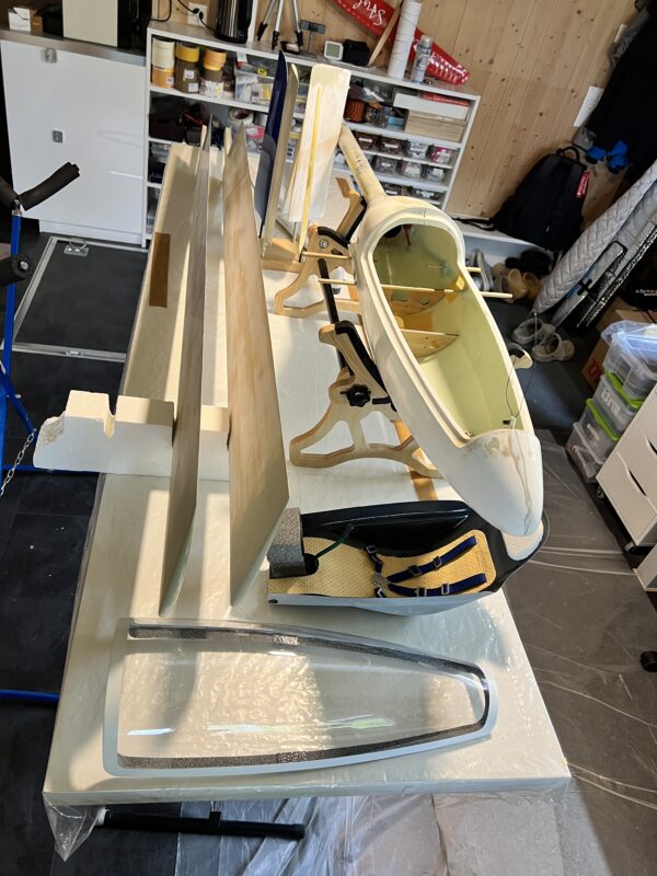 The Monnett Monerai has been back from the paint shop since early June 2024 already. It’s been sitting in my workshop waiting for the next step in the build. I hope to finally have some time to work on in the next few weeks and will post an update as soon as possible. Here’s a “teaser” from the assembled glider. Our building team member Andi did a great job once again spray painting it.
