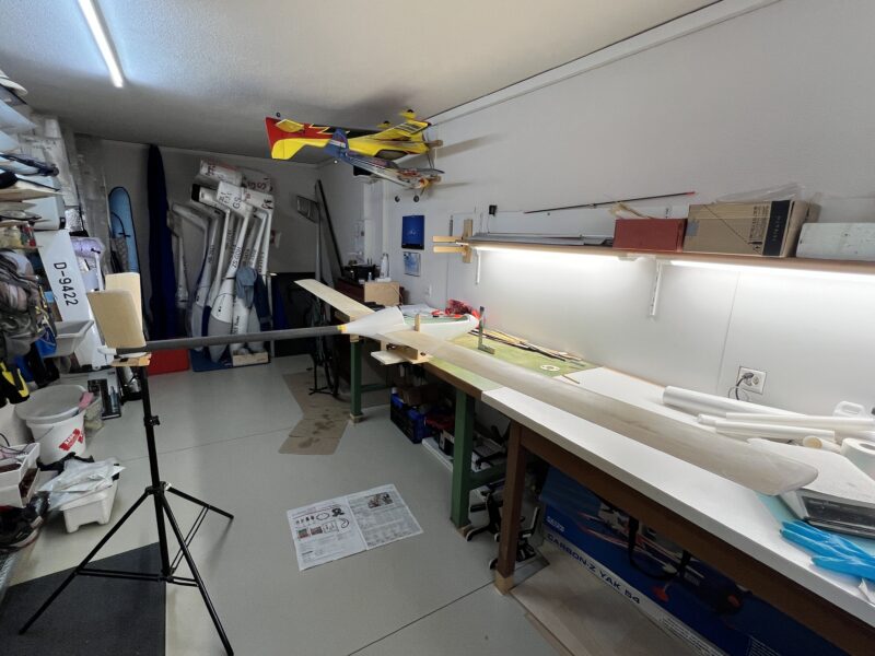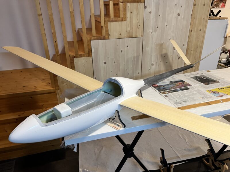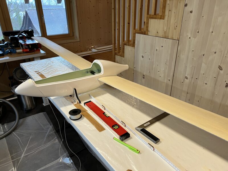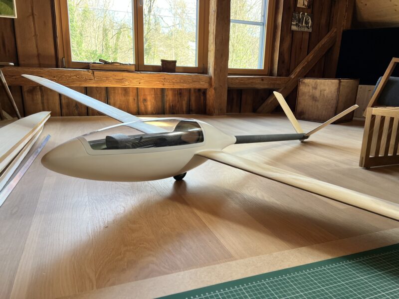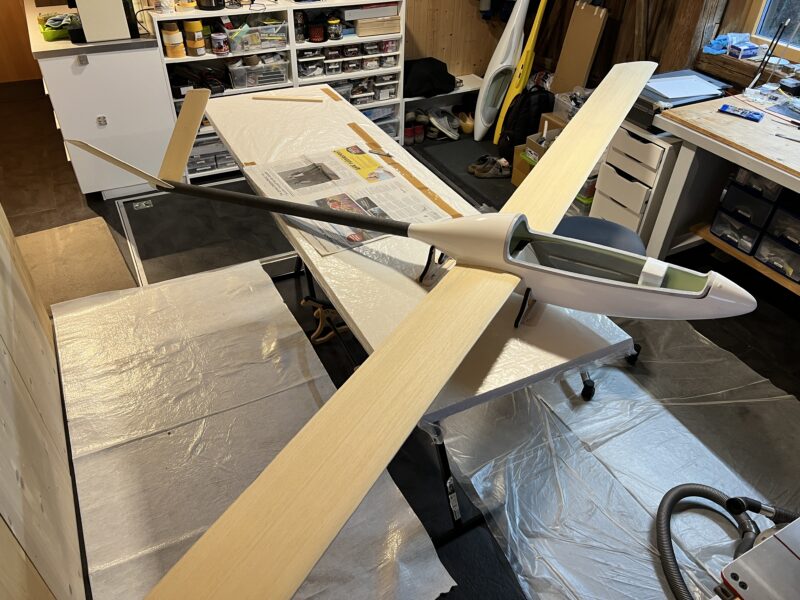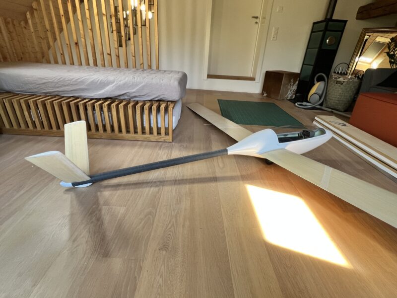 I weighed the total setup, and I expect the glider to have a flying weight of around 3.6kg – including around 60gr of lead in the nose. Pretty good.