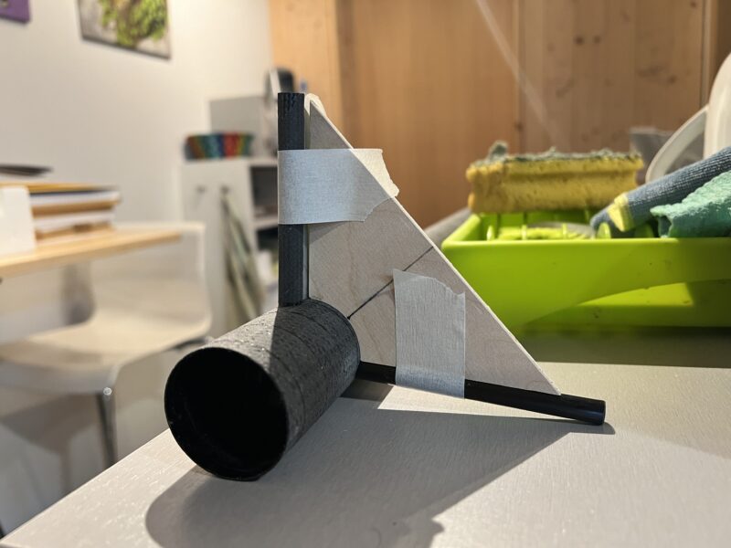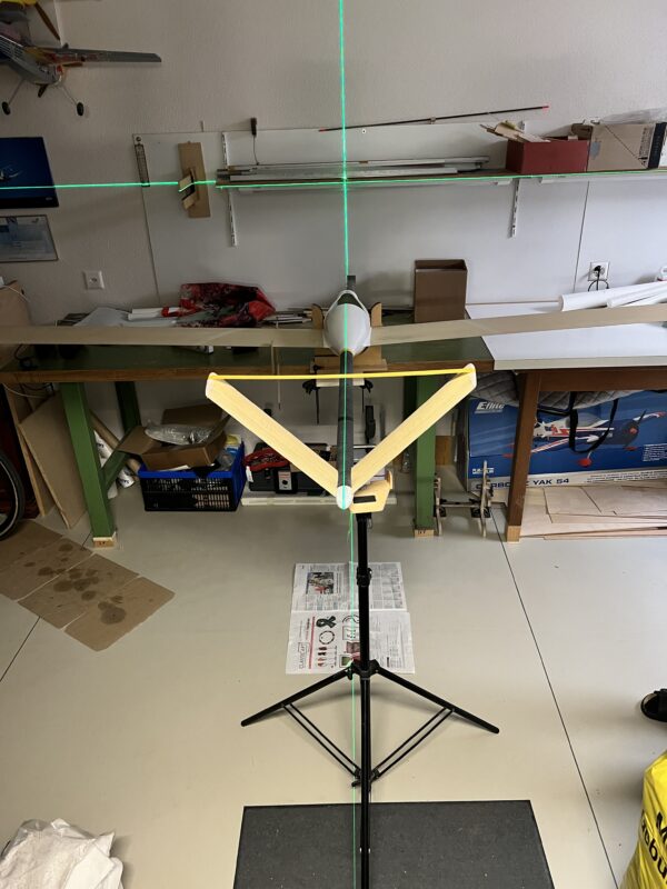 I’ve been putting off fitting the tailboom of the Monerai – too many variables and things that can go wrong. In the end I asked my mate Georg to help me. He’s the one who usually does the wing positioning of the plugs of our new models and also has the right gear and space. I had already mounted the tailplane at a 0 degree angle to the tail boom. That left deciding on the length of the tailboom, the right incidence of the tailplane in comparison with the wings and the exact positioning of the tailboom and V-tail.