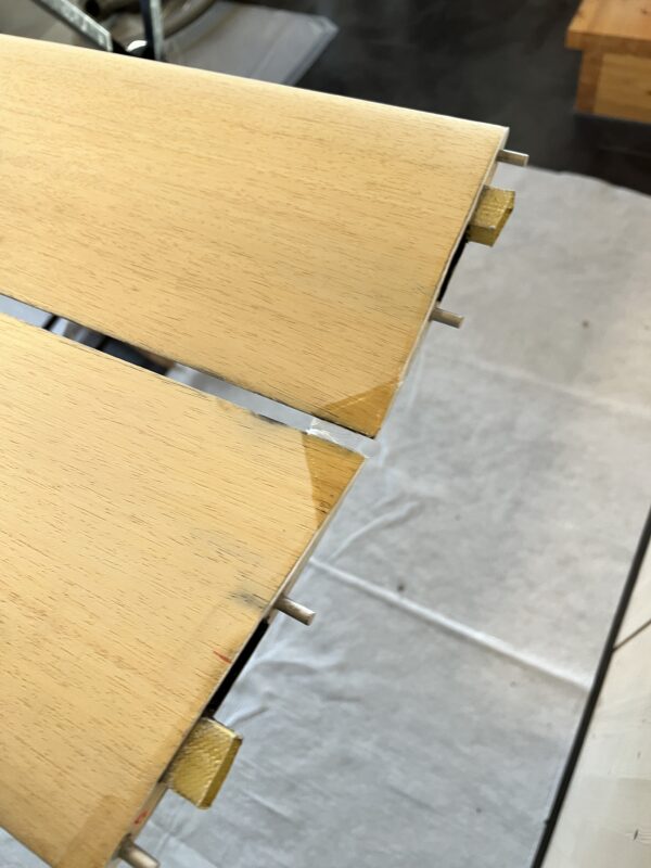 I first do the underside, making sure that the glass is about the middle of the leading edge. After applying the glass I hang the wings leading edge up on the wing joiner and a piece of wood to let the resin fully cure (without warping the wings). After the resin is cured I will use a razorblade to cut away the excess glass and gently sand the edges.