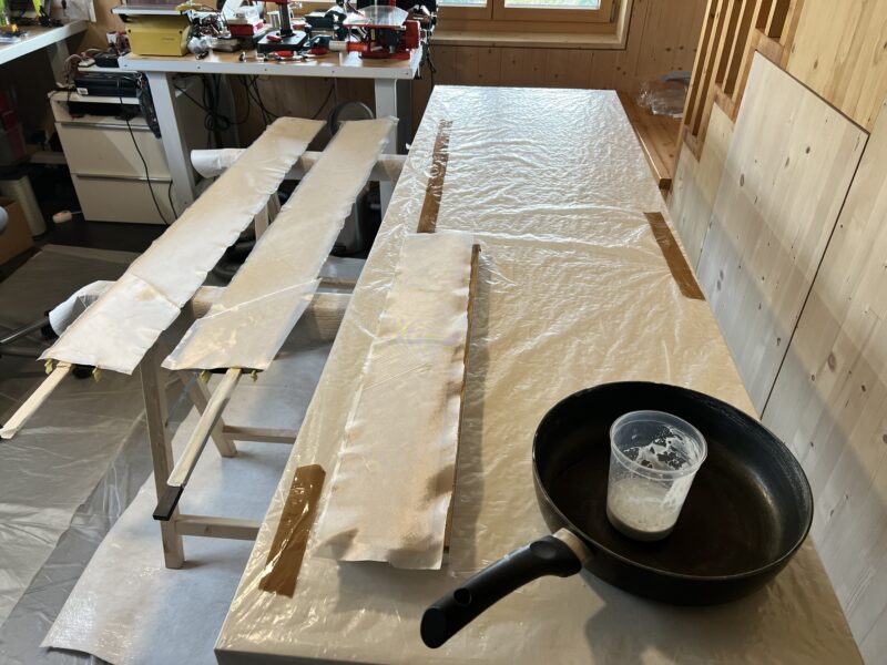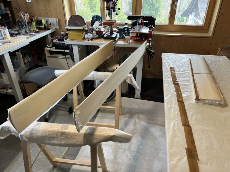 Tomorrow I will do the upper side of the wings and tailplane in the same manner, with the only difference that I’ll wrap the glass over the entire leading edge. In total I need around 2x25gr of thinned down resin per side of each wing.