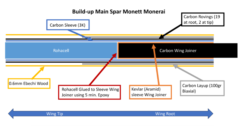– in the area after the wing joiner (from inside to outside): rohacell core; 3k carbon sleeve (reducing to 1k towards the tip); 19 carbon rovings (reducing to 2 at the wing tip); carbon layup (100gr biaxial); ebechi.
