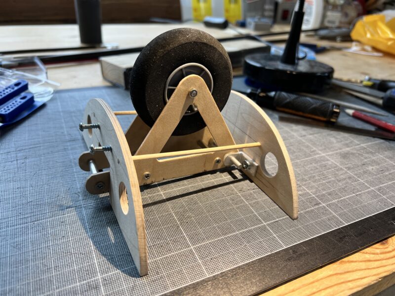 The design of the landing gear is very much based on the well-tested design of our Urupema and Orlik – just smaller, with a 70mm foam wheel. The front and rear bulkhead are 4mm plywood and designed “by hand”. The sides of the gear were designed on QCAD and will be milled from 2.5mm glass fiber. To check if all the bits fit together and are sufficiently stable I first cut them out of 2mm plywood. A flying buddy will mill them out of glass fiber for me next week. The front and rear bulkhead are held together using wooden sticks that are just there for correct positioning and will be removed once the gear is glued into position in the fuselage. The suspension will be bicycle inner tubes.