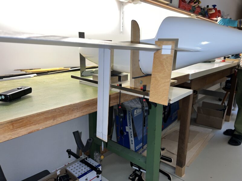 The next step on the tailplane is to check if any bits need protection or correction using a some resin (if necessary coloured white). After that I position the control surfaces using good quality wax tape and 1mm thick pieces of balsa-wood. I then apply silicon glue (Wacker Elastosil E41) using a syringe with a 3/2 mm aluminium tube, wiggle the control surface a couple of times and then fix in place using leftover bits of ebechi wood with double-sided tape. Leave that to cure for 3-4 days and then carefully remove the wax tape (don’t pull out the silicon!) and the tailplane is ready for the servos to be built in.