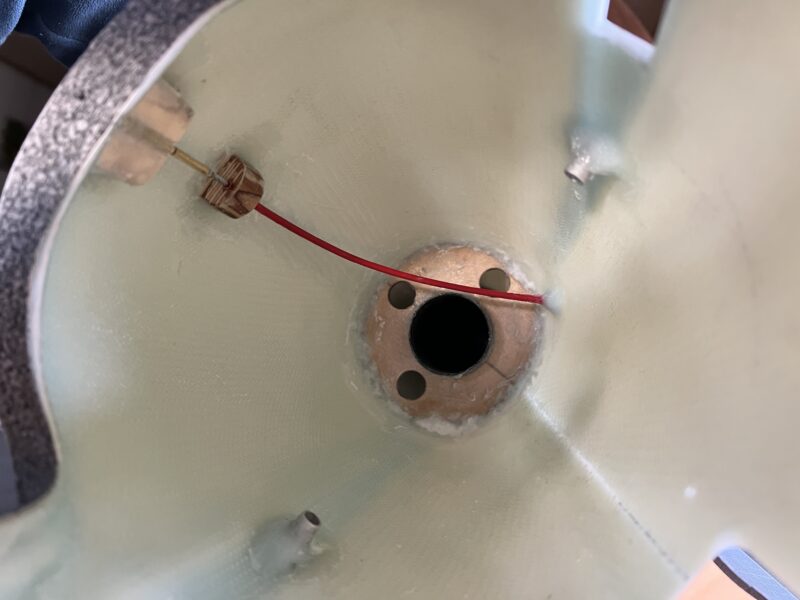We first positioned and fixed the fuselage pod and wings at an incidence of exactly 1.3 degrees, so that the tail boom could be fixed horizontally. We then prepared a support for the tail boom and roughly aimed it in the right position. Then we removed the tail boom, prepared epoxy resin and glued the tail boom into the correct position. Using our laser we double-checked everything and allowed the epoxy to cure. The next day I prepared and added some thickened epoxy on the inside of the fuselage as well as plywood bulkhead. I also used 10cm of leftover tailboom to reinforce the inside of the tail boom where it is glued into the fuselage (cutting it open on one side to reduce the diameter so that it fits).