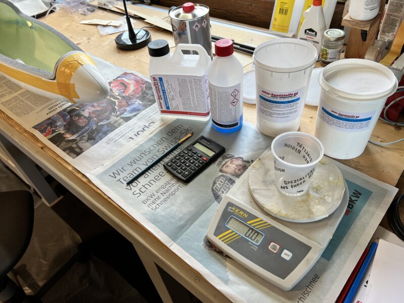 A short “how to”: First we get rid of the orange skin structure by wet sanding all painted surfaces with 800 grit sanding pads (Georg even starts with 600 grit sandpaper), followed by 1500 grit and then a 3000 grit sanding pad (all by hand). After that we machine polish all surfaces using a fast cut compound, followed by a machine polish compound. See the last picture below for the materials used. In Switzerland we purchase all materials through sury.ch – unfortunately only in larger quantities, but then they last a lifetime of building gliders.