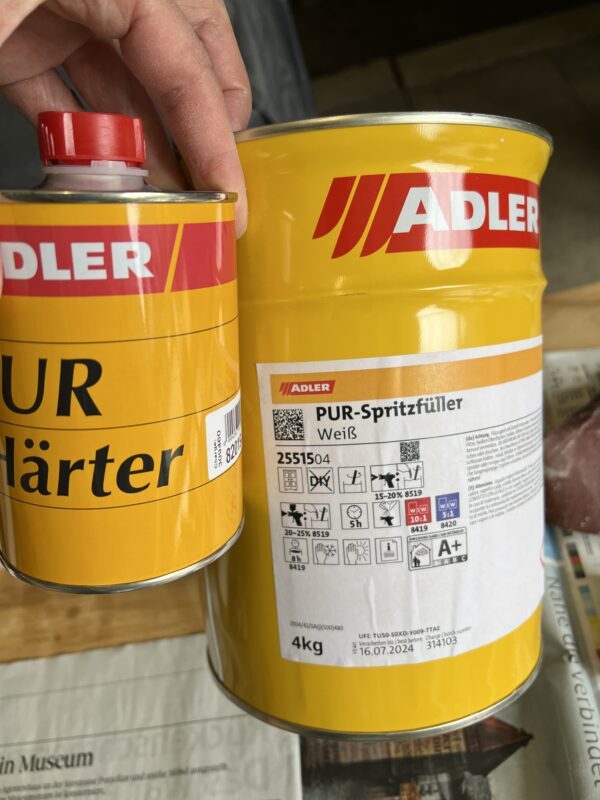 I first lightly sanded and cleaned the glassed wings. Then I applied the first coat of filler. Andi provided a new product from Adler. It’s pretty easy to handle and easy to sand, but stinks like hell. I thus had to wait for a day with decent weather so that I could work in the open and well aired barn – still using a good face mask and gloves. We usually apply the first coat with a filling knife, but this time I used a paintroller. This may well have been a mistake, as I may have more remaining pinholes than usual (we’ll see that after it comes back from the paint shop). After letting the first coat of filler cure for a night (in the warm workshop) I then sanded the wings using my small electric sanding machine (A bosch PSM160A) with 180 grit paper for the larger surfaces. I recently purchased a connector and flexible tube to connect it to my vacuum cleaner and was pleased by how much that reduced the amount of dust (and less pleased by the amount of work to clean the vacuum cleaner afterwards). smaller surfaces I sanded by hand, using 280 grit sanding paper. I repeated the entire process to make sure that all areas were well filled. I also used a spraycan of colormatic filler to make small corrections at the wingtips and on top of the tailplane, also in an effort to remove any remaining pinholes on the upper side of the tailplane and wings.