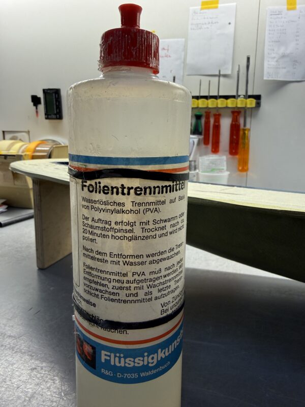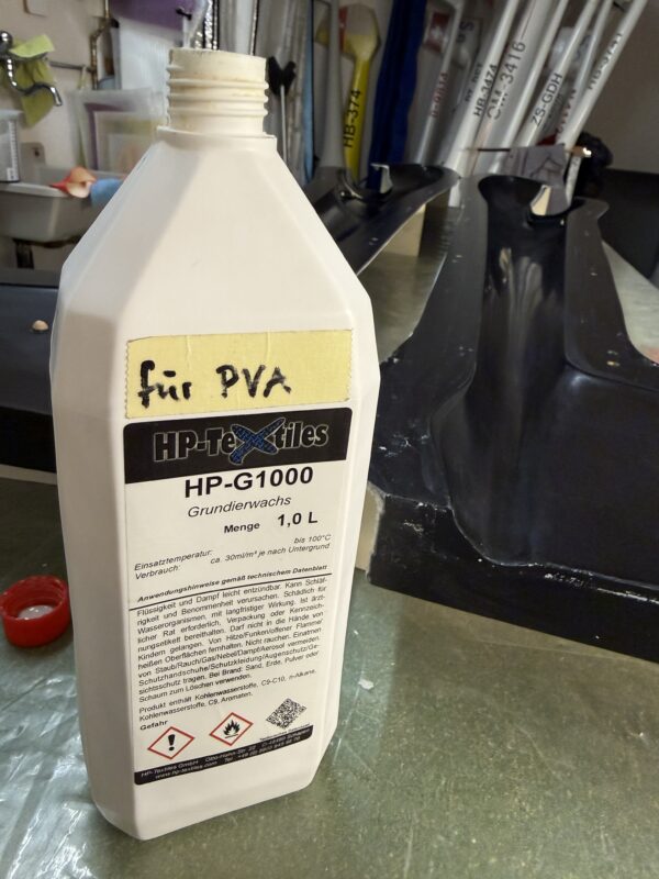 – Using the right wax in the right places is key. For building the fuselage mould we use: 1) a coat of HP-G1000 priming wax (HP Textiles); followed by 2) three coats of a release agent based on polyvinyl alcohol, dissolved in a mixture of ethanol and water (SCS PVA-folientrennmittel). We’ve used this for building all our recent moulds and never had any issues releasing the plug from the mould..