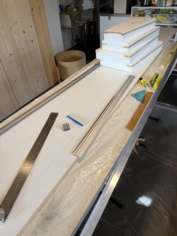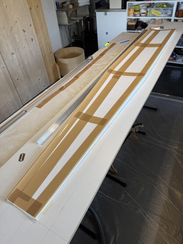 After preparing the foam cores (see previous post) comes the incredibly important work of drawing the layout of the wings onto the building board and positioning the foam shells. We build upside down (upper side first). Once all the measurements are done and double-checked I position the foam shells and glue them to the building board using painter’s tape. Then I apply thin brown packaging tape on the edges of the shell on the board as well as to the individual shells of the underside of the wing. It’s important to find a packaging tape that doesn’t stick to epoxy resin – the purpose is to avoid the shells sticking to the wing core or other shells.