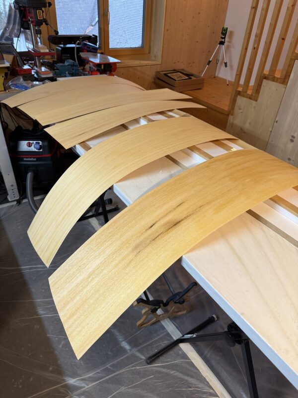 - Ebechi wood: we use 0.6mm ebechi wood, prepared by a carpenter we know or through RIK Modellbau (https://www.balsa.ch/shop/abachi/).