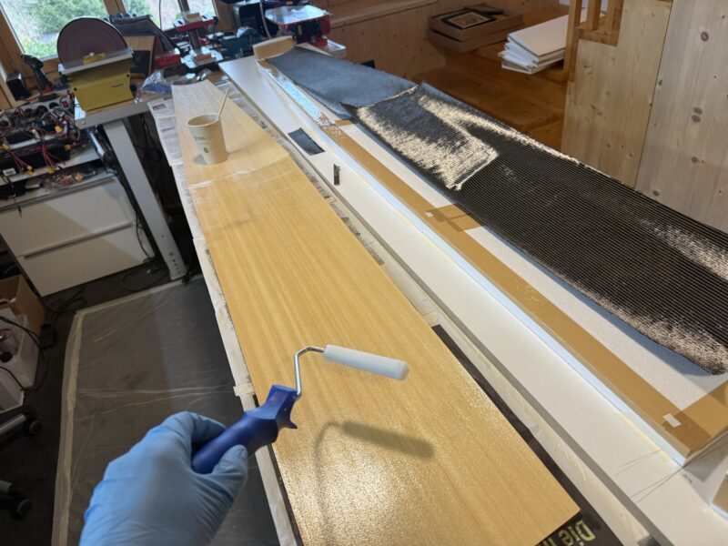 Once all that is done it’s time to prepare the resin. I used around 60 grams of resin for the upper side. It is possible to do it with 10-15 grams less for weight watchers. Using a small roller I apply the resin to the parts of the ebechi sheet where the carbon layup is coming. I then put the carbon layup onto the ebechi and push it on using the roller. Then I use the roller to apply most of the resin to the carbon layup. I leave a few grams of resin and add a few drops of foaming agent and let this rest a bit. I then use a hard rubber roller and kitchen paper to roll excess resin off the carbon layup. Then use the soft roller to apply the remaining resin with foaming agent to the parts of ebechi not covered with carbon.