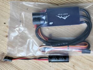 Also handy is that the Dualsky ESC comes with a capacitator included in the package – an essential component for every setup using newer high voltage servos. These servos supply power back to the onboard electronics if they are moved or under pressure. Club colleagues have run some tests with this – with very worrying results. These return currents can cause the receiver to briefly reset itself – and thus leave the glider without control for a brief moment. A capacitator installed into the electronics, close to the receiver, equals out power peaks in the system and avoids such reset. The Dualsky Summit 100 Light has a good quality capacitator included with the ESC. I plug that capacitator into the S.Hub next to the receiver(s).