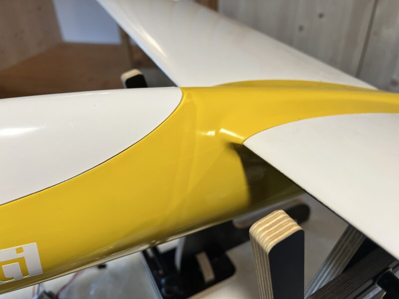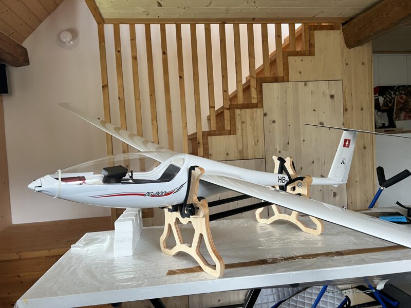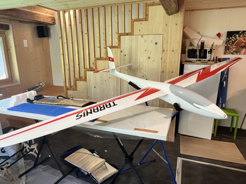 My favourite plane for our local slope (Pfannenstiel – 10 minutes from where I live) is the Chocofly 2.8m Taranis. Its combines speed with stability, loves a bit of ballast and yet is light enough for an easy hand start. Most importantly, it has a tremendous speed spectrum (easy thermalling to really very fast – well over 300kmh – unballasted) and is very uncritical to fly – unlike for instance my Chocofly Kobuz, which is a great glider for heavy slope conditions, but is trickier to fly and doesn’t have the versatility of the Taranis. I was lucky to get one of the first production models of the Taranis when it came out in 2019 and built the prototype with a FES system (6S with our usual Leomotion/Dualsky outrunner). A video of one of the first flight of my Taranis (with information on the setup) can be found here. The flight on the video is without ballast. With a bit of ballast it’s way faster :-).
