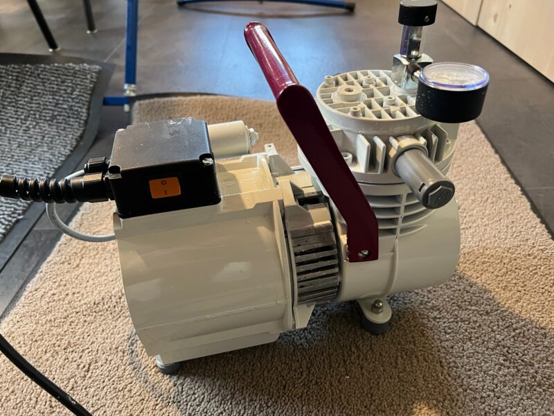 With my previous projects I built the wings and stabilisers together with Andi, using his workshop and pump, or borrowed a vacuum pump. As I hope to build quite a few more planes in the future and wanted to have a go at building a glider all by myself, I though it was time to purchase my own vacuum pump. For building the horizontal stabilisers I used a small KNF vacuum pump that I purchased second hand a while ago. It worked well with the smaller vacuum bags, but it will be at it’s limit with the larger bags that building the wings of the Ventus and the Diana 4 will require. Last month I thus ordered a larger pump through Lindinger – it’s also a KNF pump, made in Germany, and distributed through R&G. It took almost a month to be delivered, and seeing the production date on the pump it looks like it was made to order. Am looking forward to trying it out on the wings of the Ventus.