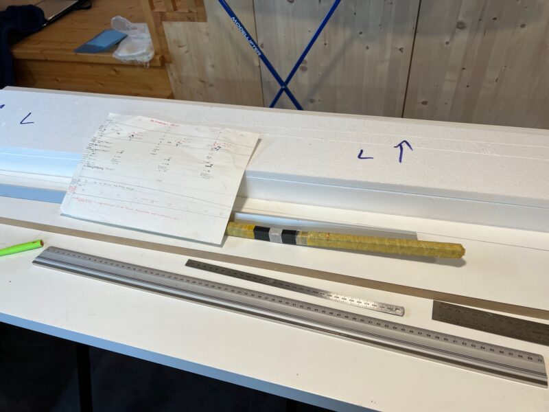 I glued together the foam cutouts of the two rear spars using 5 minute epoxy and pulled over a carbon sleeve. The core of the main spar is made out of Rohacell – a dreadfully expensive material, but very easy to sand into the right size. The size for the Rohacell core of the main spar can easily be calculated using the really cool excel sheet by Christian Baron (link to the 2013 version, example filled out for an ASK18). In this case I used the layout that was used for the Ventus 2c built by Georg over 20 years ago – with a few minor modifications. The spar will be much more robust than needed, but since I plan to mostly use this plane on the slope, the extra stiffness is welcome. I’ll have 2×20 1600k carbon rovings at the root, reducing by one roving every 10cm, finishing with 2×2 rovings at the start of the penultimate wingsegment. The bits of the main spar are also glued together using 5 minute epoxy and then covered with a carbon sleeve.