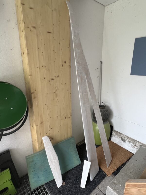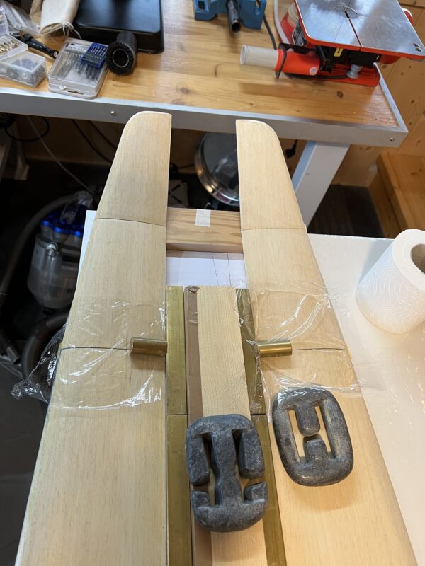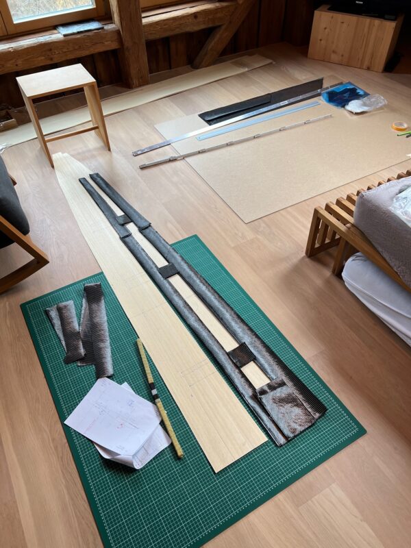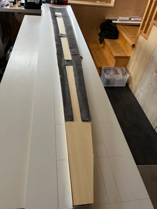 It’s always satisfying to see the wings of a new build for the first time “in full”. I spent two mornings with help of my flying buddy EP to close both wings – the first time I am doing this in my own workshop. I was a bit nervous about how accurate my calculations for the thickness of the main spar were (if you get it wrong then the carbon roving “overflow” from the cutouts, which is a pain to correct afterwards) – but they proved about right. I’m also not unhappy with the weight of the wings: 588 and 594gr. I’ll be able to reduce the slight difference in weight when sanding down the ebechi. The wings are around 40gr heavier than the ones built in my club twenty years ago (they came out at around 450gr). The reason for that is that all inserts in the wing are carbon rather than a combination of kevlar, glass and carbon in the earlier builds. The biggest difference is that I significantly beefed up the amount of carbon rovings in the main spar – the wing is nice and stiff – perfect for the slope :-).
