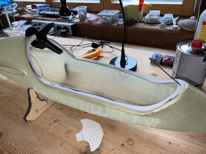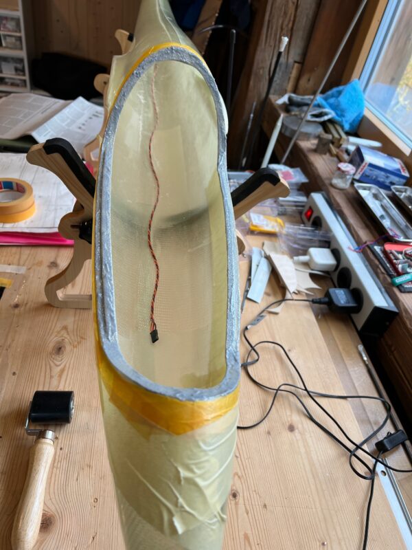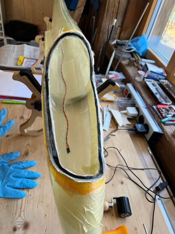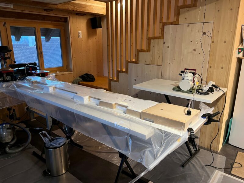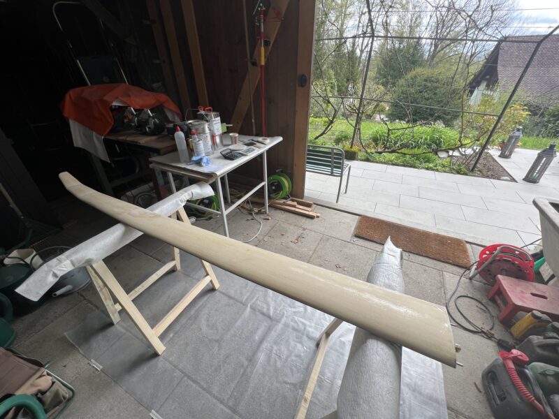 I’m only planning to finish the Monerai next winter and hope to maiden it in Spring 2024. Richi, our shaper, however already finished the mould for the Monerai’s fuselage pod and built the first pod. He also kindly waxed and spray painted the mould for me, and pre-cut the glass, so that I could easily build the fuselage pod in the mould myself.