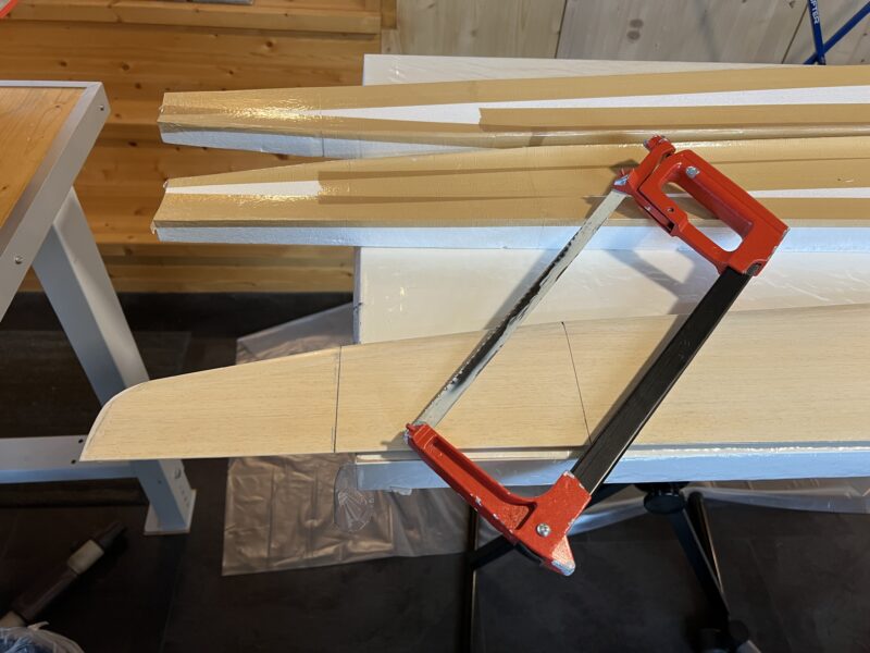 The Ventus wing has multiple dihedrals. The first two were built into the wing as part of cutting the wing’s foam core. The last two (6 and 15 degrees) were too much for the thickness of the foam and must be added after the wing is completed. As it only concerns the outer two wing segments, there is no need for complicated spars or internal reinforcements. I simply separated the last two segments with a saw, sanded them back to get the right angle, removed some of the foam on both sides of the cut and re-attached the two segments using epoxy resin thickened with cotton flakes and aerosil. I did this in two steps, to make sure that I got the right and identical dihedrals on both wings. After letting the epoxy cure I will put a thin strip of 49gr glass fiber (45 degree fibers) over the seams, both on top and underneath the wings. That should be strong enough for this glider.