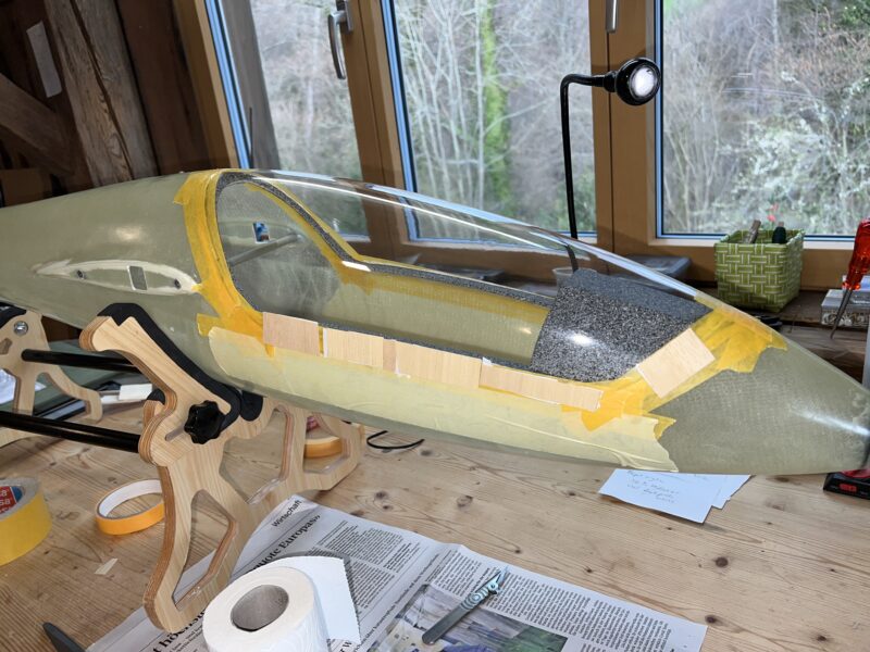 Once I have a fit that I’m satisfied with it’s time to glue the canopy to the frame. I do this using epoxy resin thickened with aerosil and micro-balloons. First I make sure that the fuselage is nicely waxed and protected with tape. Then I use a syringe to add glue all over the frame. Then comes the tricky part: carefully place the canopy over the frame and center the front and rear markings. Then I use wax tape to glue the frame in place. In areas where the frame is standing out I use leftover ebechi wood (vertical grain) with double-sided tape to make sure that the canopy is level with the fuselage. Now it’s time to let the resin cure and see how well I did this time.There will always be places where there was too much or too little epoxy, and I’ll need to make some small corrections after the first epoxy is cured.