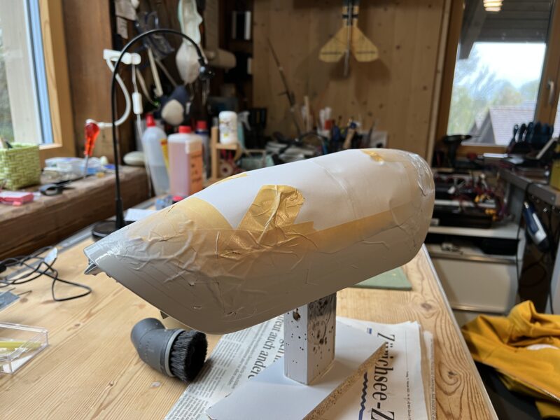 I’ve built fourteen fuselages together with our “master builder” Georg, but never did one all by myself. A small fuselage pod for the Monerai was thus a great opportunity to try it out. Even with such a small fuselage it took me over three hours (even with three instead of the usual four layers of glass), not including preparations and cleaning up. I also made a few mistakes along the way, but fortunately realised and corrected them on time.