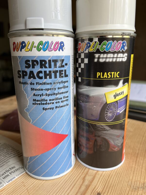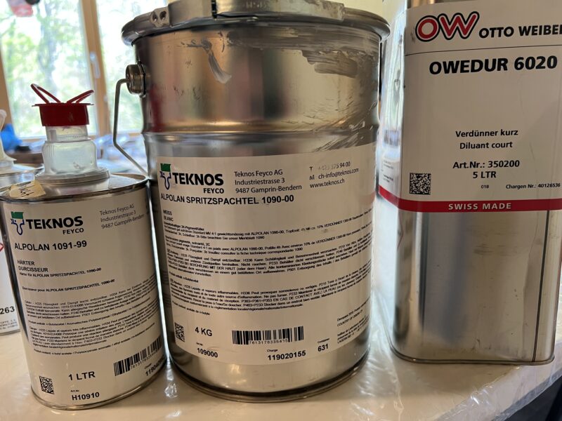 Before having the wings and tailplane spray painted, they first need a coat of primer to ensure an even surface and fill the structure of the glass covering and any pinholes in the glass covering. This is a terribly messy and smelly job, best done in a well-ventilated area on a not too cold/not too warm day. Not one of my favourite bits. I apply the primer using a metal “Japan Spachtel” (Japan or Surface spatula) and a paint brush. Note that this primer is extremely agressive and will dissolve plastic containers as well as normal paint rollers. I also use a good mask while applying it.