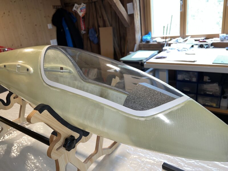 Building the canopy frame is always a bit of a pain. Here’s the method we use. First applying loads of tape to protect the fuselage in the parts around the frame. Then apply three layers of wax (leaving each layer to dry and polishing it carefully with some soft cloth). Then apply some thickened and coloured epoxy resin (with a “fast” hardener) and wait for the epoxy to cure a bit. Then I applied a layer of 100gr glass fiber, followed by four carbon rovings (entire length). I again waited for the epoxy to cure a bit. And then the “construction work” begins. Using coloured epoxy, thickened with lots of microballoons (so it stays in shape when applied) I built up the canopy frame on top of the carbon rovings/glass base. The result usually looks quite messy, but that doesn’t matter. Just make sure you apply enough material, so that you can sand away enough to get the frame into shape. I usually wait a few days for the epoxy to fully cure before sanding the frame into shape. Before sanding, make sure you drill the holes for the front pin and the rear lock. I always sand the inner part of the frame before releasing it from the fuselage. I use 2mm steel wire for both the front pin and the lock.